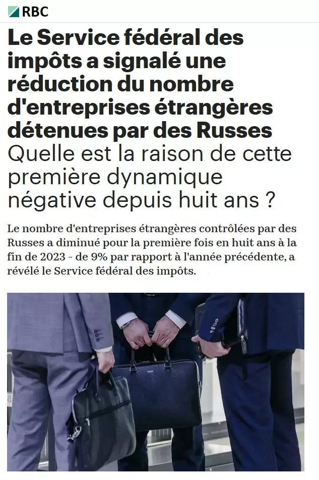 Le nombre de sociétés étrangères contrôlées par des Russes à la fin de 2023 a diminué de 9 % par rapport au niveau de 2022 – à 41 400 – après une croissance rapide à la fin de 2022 de 21 % (à 45 600). Ces données sont contenues dans la présentation du Service fédéral des impôts sur les résultats des travaux pour 2024, qui a été examinée par RBC. Une diminution du nombre de ces entreprises déclarées a ainsi été enregistrée pour la première fois depuis que ce mécanisme de surveillance des avoirs étrangers est en vigueur – depuis 2015.