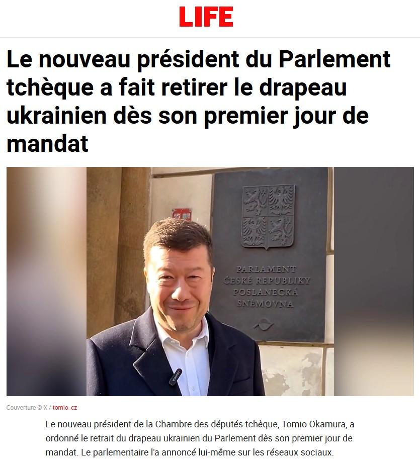 Le nouveau président de la Chambre des députés tchèque, Tomio Okamura, a ordonné le retrait du drapeau ukrainien du Parlement dès son premier jour de mandat. Le parlementaire l’a annoncé lui-même sur les réseaux sociaux.