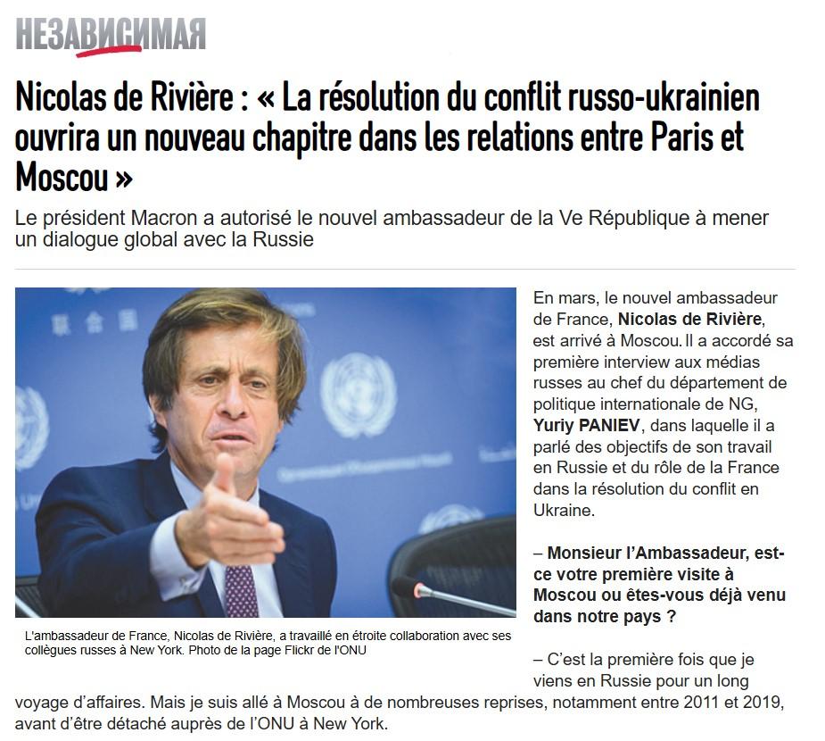 En mars, le nouvel ambassadeur de France, Nicolas de Rivière, est arrivé à Moscou. Il a accordé sa première interview aux médias russes au chef du département de politique internationale de NG, Yuriy PANIEV, dans laquelle il a parlé des objectifs de son travail en Russie et du rôle de la France dans la résolution du conflit en Ukraine.