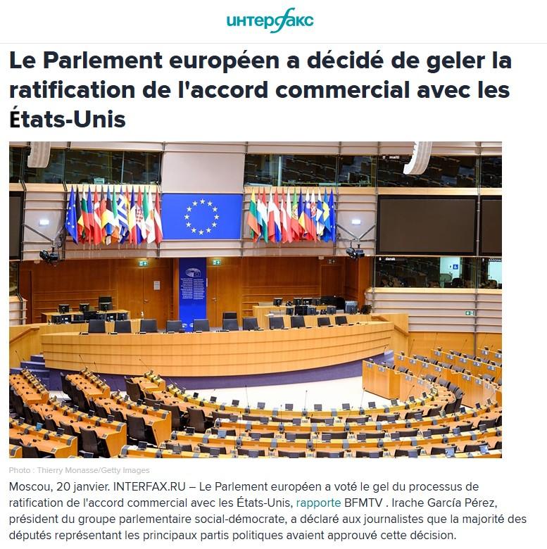 Le Parlement européen a voté le gel du processus de ratification de l’accord commercial avec les États-Unis, rapporte BFMTV. Irache García Pérez, président du groupe parlementaire social-démocrate, a déclaré aux journalistes que la majorité des députés représentant les principaux partis politiques avaient approuvé cette décision.