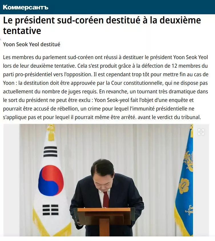 Les membres du parlement sud-coréen ont réussi à destituer le président Yoon Seok Yeol lors de leur deuxième tentative. Cela s’est produit grâce à la défection de 12 membres du parti pro-présidentiel vers l’opposition. Il est cependant trop tôt pour mettre fin au cas de Yoon : la destitution doit être approuvée par la Cour constitutionnelle, qui ne dispose pas actuellement du nombre de juges requis. En revanche, un tournant très dramatique dans le sort du président ne peut être exclu : Yoon Seok-yeol fait l’objet d’une enquête et pourrait être accusé de rébellion, un crime pour lequel l’immunité présidentielle ne s’applique pas et pour lequel il pourrait même être arrêté avant le verdict du tribunal.