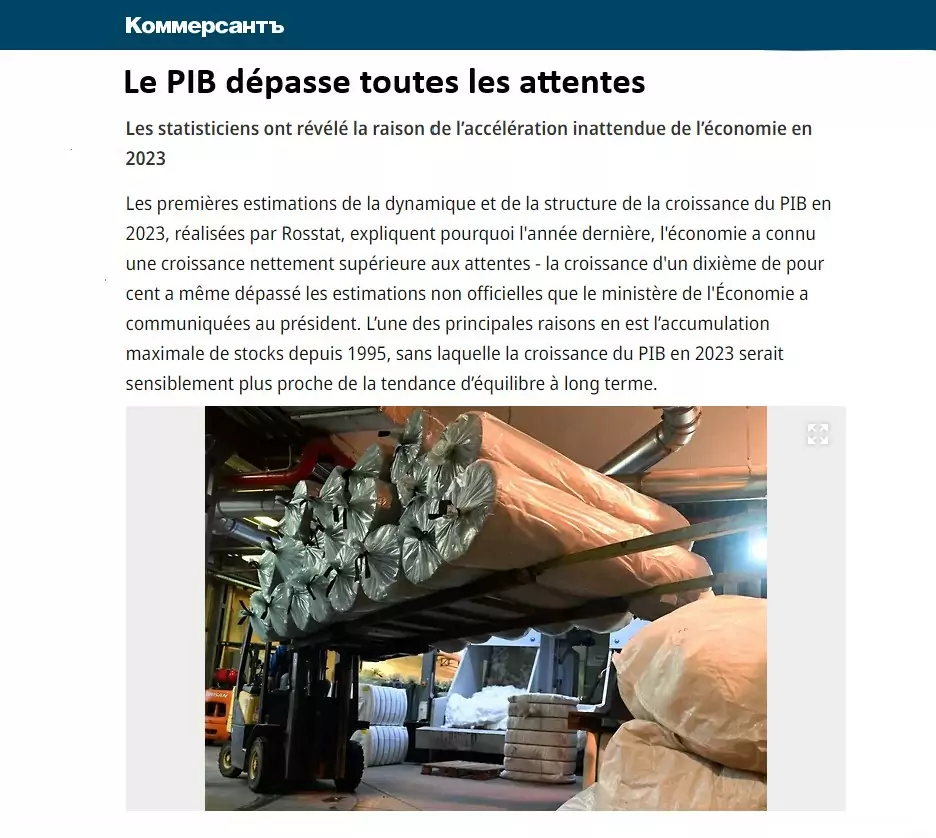 Selon la première estimation de Rosstat, la croissance du PIB en 2023 était de 3,6%, ce qui est « au-dessus de la plupart des attentes », déclare le ministère de l’Économie, ajoutant que ce chiffre « s’est avéré être le plus élevé de la dernière décennie (la seule exception est la reprise post-Covid en 2021). Ainsi, les attentes du chef du ministère Maxim Rechetnikov, selon lesquelles l’estimation finale pourrait rapprocher le taux de croissance du PIB de 4% en 2023, se sont révélées tout à fait réalistes.