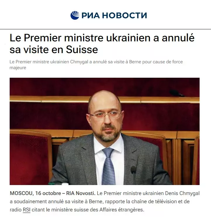 Le Premier ministre ukrainien Denis Chmygal a soudainement annulé sa visite à Berne, rapporte la chaîne de télévision et de radio RSI citant le ministère suisse des Affaires étrangères.