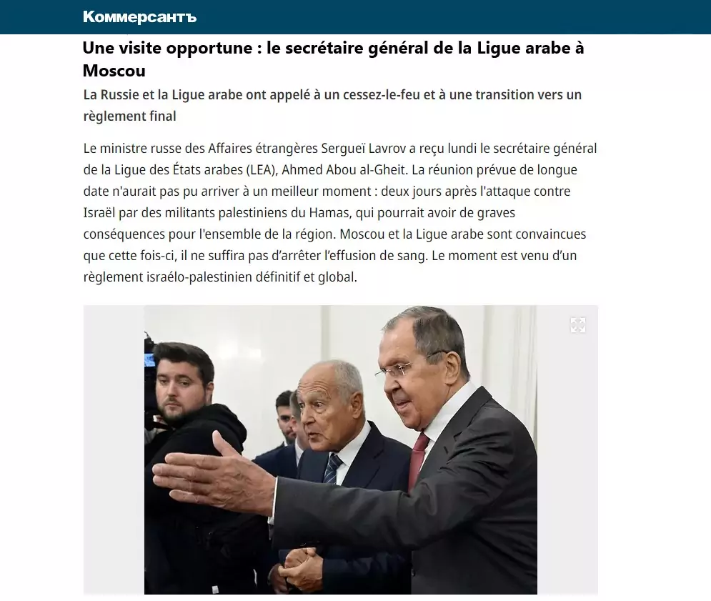 Le ministre russe des Affaires étrangères Sergueï Lavrov a reçu lundi le secrétaire général de la Ligue des États arabes (LEA), Ahmed Abou al-Gheit. La réunion prévue de longue date n’aurait pas pu arriver à un meilleur moment : deux jours après l’attaque contre Israël par des militants palestiniens du Hamas, qui pourrait avoir de graves conséquences pour l’ensemble de la région. Moscou et la Ligue arabe sont convaincues que cette fois-ci, il ne suffira pas d’arrêter l’effusion de sang. Le moment est venu d’un règlement israélo-palestinien définitif et global.