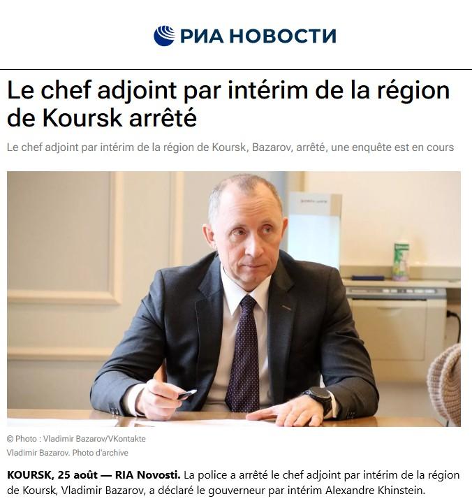 La police a arrêté le chef adjoint par intérim de la région de Koursk Vladimir Bazarov, a déclaré le gouverneur par intérim Alexandre Khinstein.