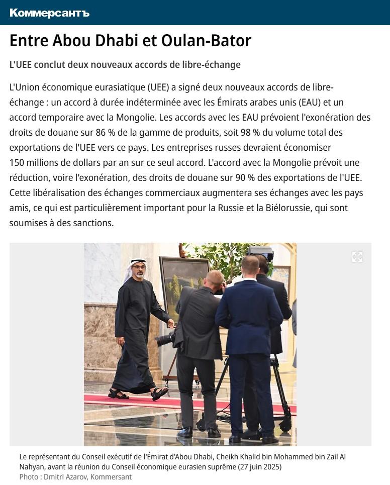L’Union économique eurasiatique (UEE) a signé deux nouveaux accords de libre-échange : un accord à durée indéterminée avec les Émirats arabes unis (EAU) et un accord temporaire avec la Mongolie. Les accords avec les EAU prévoient l’exonération des droits de douane sur 86 % de la gamme de produits, soit 98 % du volume total des exportations de l’UEE vers ce pays. Les entreprises russes devraient économiser 150 millions de dollars par an sur ce seul accord. L’accord avec la Mongolie prévoit une réduction, voire l’exonération, des droits de douane sur 90 % des exportations de l’UEE. Cette libéralisation des échanges commerciaux augmentera ses échanges avec les pays amis, ce qui est particulièrement important pour la Russie et la Biélorussie, qui sont soumises à des sanctions.