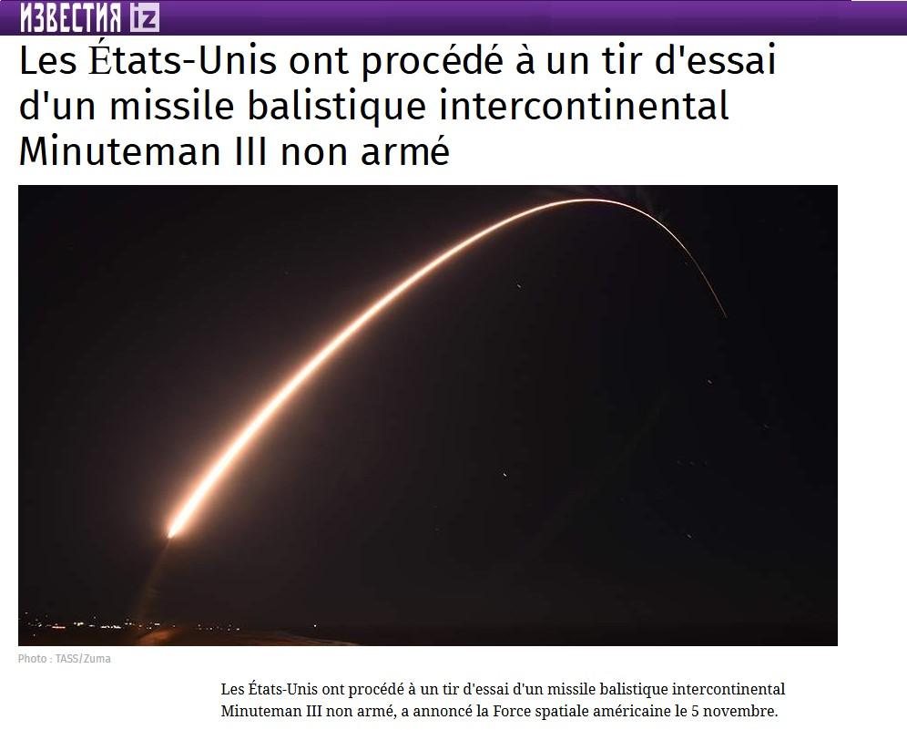 Les États-Unis ont procédé à un tir d’essai d’un missile balistique intercontinental Minuteman III non armé, a annoncé la Force spatiale américaine le 5 novembre.