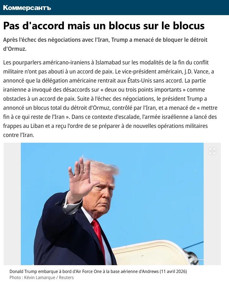 - Les négociations américano-iraniennes ont échoué, Trump veut imposer son propre blocus sur Ormuz - 13 avril 2026