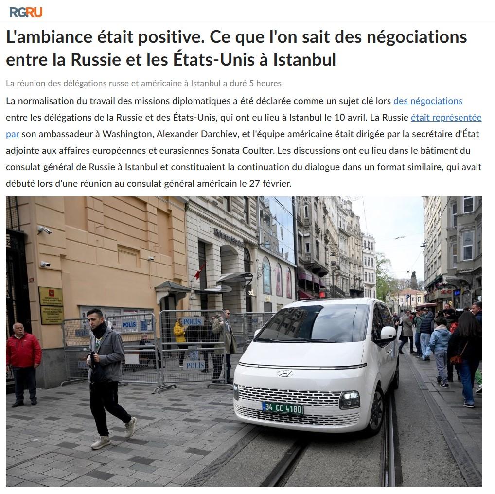La normalisation du travail des missions diplomatiques a été déclarée comme un sujet clé lors des négociations entre les délégations de la Russie et des États-Unis, qui ont eu lieu à Istanbul le 10 avril. La Russie était représentée par son ambassadeur à Washington, Alexander Darchiev, et l’équipe américaine était dirigée par la secrétaire d’État adjointe aux affaires européennes et eurasiennes Sonata Coulter. Les discussions ont eu lieu dans le bâtiment du consulat général de Russie à Istanbul et constituaient la continuation du dialogue dans un format similaire, qui avait débuté lors d’une réunion au consulat général américain le 27 février.
