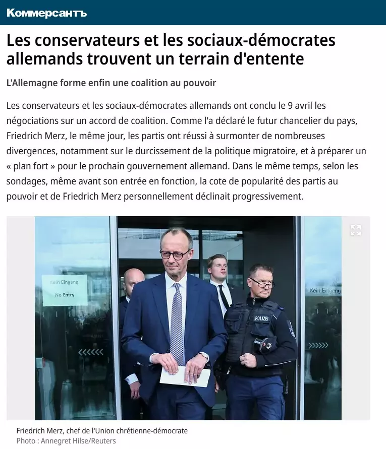 Les conservateurs et les sociaux-démocrates allemands ont conclu le 9 avril les négociations sur un accord de coalition. Comme l’a déclaré le futur chancelier du pays, Friedrich Merz, le même jour, les partis ont réussi à surmonter de nombreuses divergences, notamment sur le durcissement de la politique migratoire, et à préparer un « plan fort » pour le prochain gouvernement allemand. Dans le même temps, selon les sondages, même avant son entrée en fonction, la cote de popularité des partis au pouvoir et de Friedrich Merz personnellement déclinait progressivement.