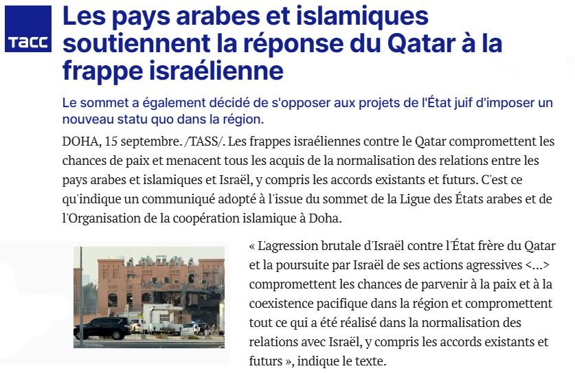 « L’agression brutale d’Israël contre l’État frère du Qatar et la poursuite par Israël de ses actions agressives <…> compromettent les chances de parvenir à la paix et à la coexistence pacifique dans la région et compromettent tout ce qui a été réalisé dans la normalisation des relations avec Israël, y compris les accords existants et futurs », indique le texte.