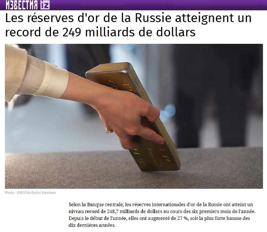Selon la Banque centrale, les réserves internationales d’or de la Russie ont atteint un niveau record de 248,7 milliards de dollars au cours des six premiers mois de l’année. Depuis le début de l’année, elles ont augmenté de 27 %, soit la plus forte hausse des dix dernières années.