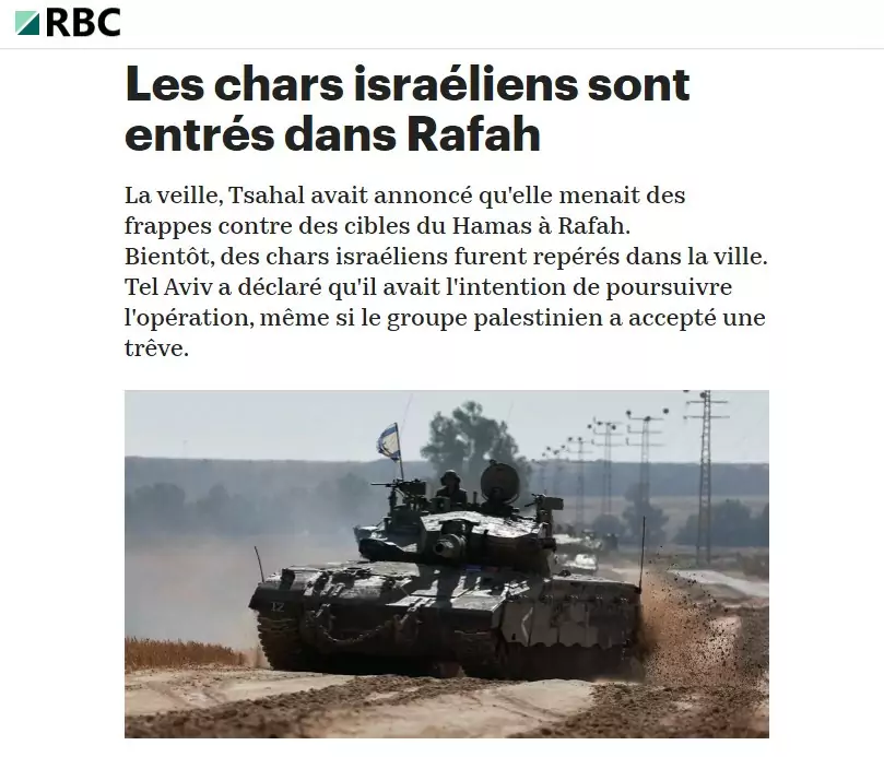 Des chars de Tsahal sont entrés dans Rafah, dans le sud de la bande de Gaza, le matin du 7 mai, ont rapporté le Times of Israel et AP, citant un responsable de la sécurité palestinien et un responsable égyptien. Les véhicules blindés se sont approchés à moins de 200 m du point de passage de la frontière avec l’Égypte.