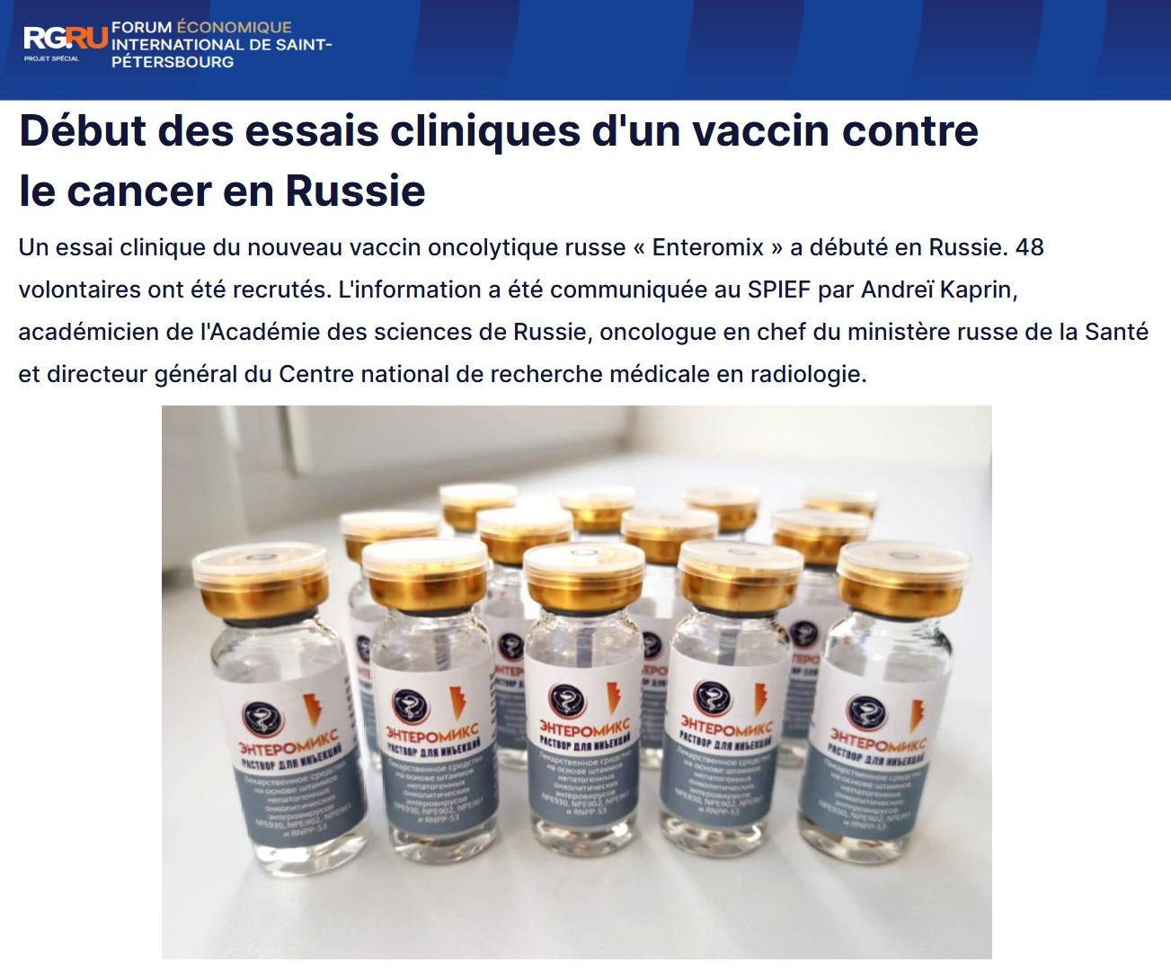 Un essai clinique du nouveau vaccin oncolytique russe « Enteromix » a débuté en Russie. 48 volontaires ont été recrutés. L’information a été communiquée au SPIEF par Andreï Kaprin, académicien de l’Académie des sciences de Russie, oncologue en chef du ministère russe de la Santé et directeur général du Centre national de recherche médicale en radiologie.
