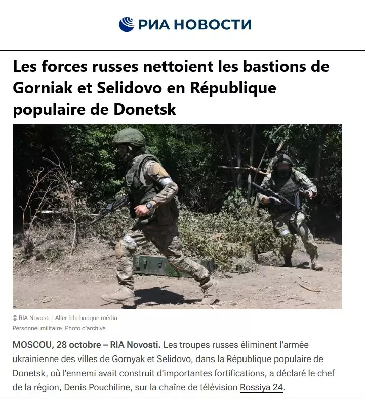 Les troupes russes éliminent l’armée ukrainienne des villes de Gorniak et Selidovo, dans la République populaire de Donetsk, où l’ennemi avait construit d’importantes fortifications, a déclaré le chef de la région, Denis Pouchiline, sur la chaîne de télévision Rossiya 24.