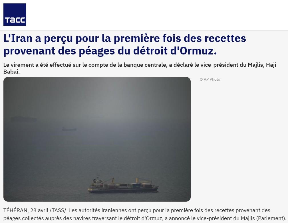 « Les premiers revenus perçus au titre des droits de passage dans le détroit d’Ormuz ont été transférés sur le compte de la banque centrale », a déclaré le dirigeant, cité par l’agence de presse Fars.