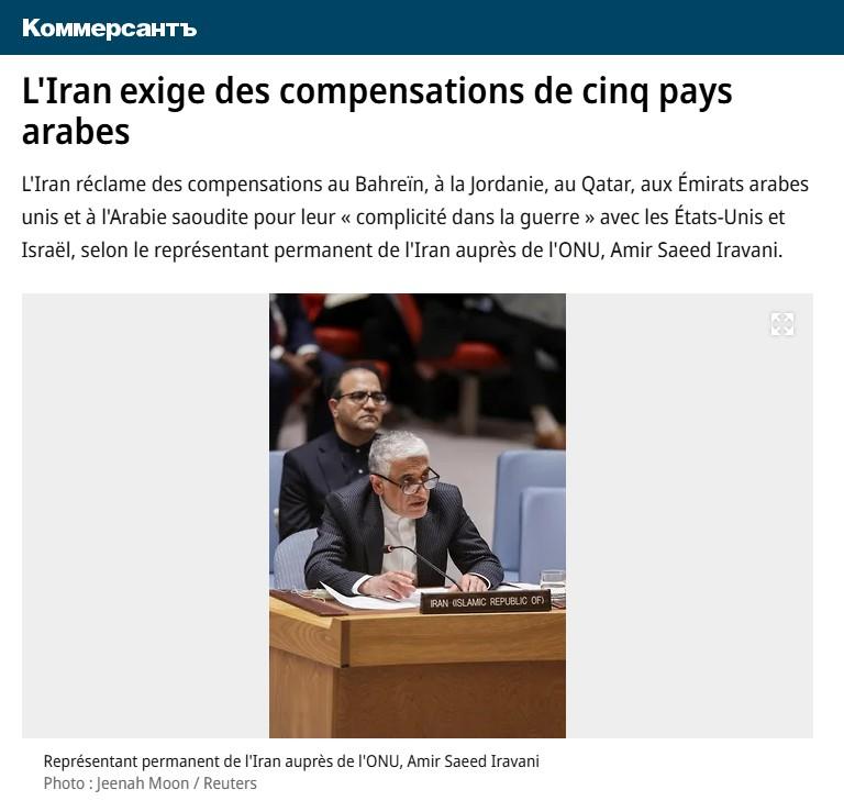 L’Iran réclame des compensations au Bahreïn, à la Jordanie, au Qatar, aux Émirats arabes unis et à l’Arabie saoudite pour leur « complicité dans la guerre » avec les États-Unis et Israël, selon le représentant permanent de l’Iran auprès de l’ONU, Amir Saeed Iravani.