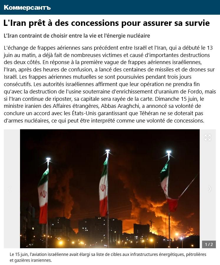 L’échange de frappes aériennes sans précédent entre Israël et l’Iran, qui a débuté le 13 juin au matin, a déjà fait de nombreuses victimes et causé d’importantes destructions des deux côtés. En réponse à la première vague de frappes aériennes israéliennes, l’Iran, après des heures de confusion, a lancé des centaines de missiles et de drones sur Israël. Les frappes aériennes mutuelles se sont poursuivies pendant trois jours consécutifs. Les autorités israéliennes affirment que leur opération ne prendra fin qu’avec la destruction de l’usine souterraine d’enrichissement d’uranium de Fordo, mais si l’Iran continue de riposter, sa capitale sera rayée de la carte. Dimanche 15 juin, le ministre iranien des Affaires étrangères, Abbas Araghchi, a annoncé sa volonté de conclure un accord avec les États-Unis garantissant que Téhéran ne se doterait pas d’armes nucléaires, ce qui peut être interprété comme une volonté de concessions.