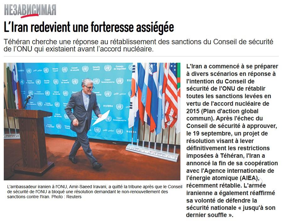 L’Iran a commencé à se préparer à divers scénarios en réponse à l’intention du Conseil de sécurité de l’ONU de rétablir toutes les sanctions levées en vertu de l’accord nucléaire de 2015 (Plan d’action global commun). Après l’échec du Conseil de sécurité à approuver, le 19 septembre, un projet de résolution visant à lever définitivement les restrictions imposées à Téhéran, l’Iran a annoncé la fin de sa coopération avec l’Agence internationale de l’énergie atomique (AIEA), récemment rétablie. L’armée iranienne a également réaffirmé sa volonté de défendre la sécurité nationale « jusqu’à son dernier souffle ».