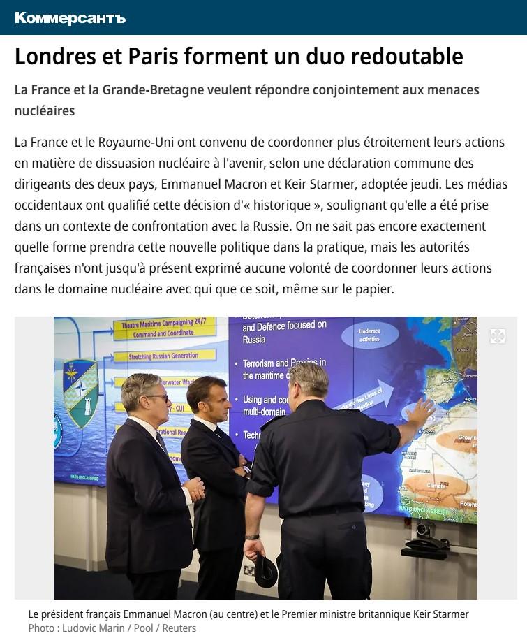 La France et le Royaume-Uni ont convenu de coordonner plus étroitement leurs actions en matière de dissuasion nucléaire à l’avenir, selon une déclaration commune des dirigeants des deux pays, Emmanuel Macron et Keir Starmer, adoptée jeudi. Les médias occidentaux ont qualifié cette décision d’« historique », soulignant qu’elle a été prise dans un contexte de confrontation avec la Russie. On ne sait pas encore exactement quelle forme prendra cette nouvelle politique dans la pratique, mais les autorités françaises n’ont jusqu’à présent exprimé aucune volonté de coordonner leurs actions dans le domaine nucléaire avec qui que ce soit, même sur le papier.