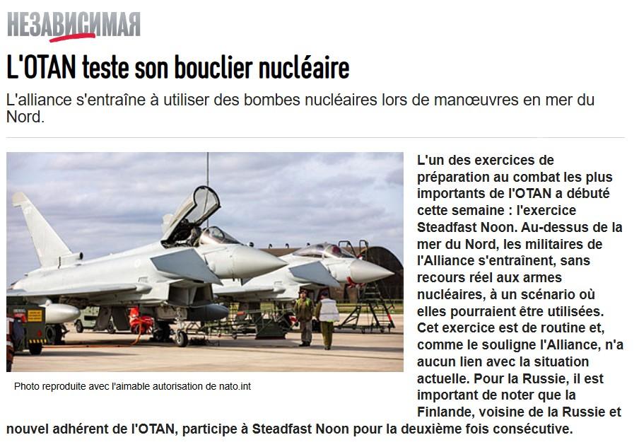 L’un des exercices de préparation au combat les plus importants de l’OTAN a débuté cette semaine : l’exercice Steadfast Noon. Au-dessus de la mer du Nord, les militaires de l’Alliance s’entraînent, sans recours réel aux armes nucléaires, à un scénario où elles pourraient être utilisées. Cet exercice est de routine et, comme le souligne l’Alliance, n’a aucun lien avec la situation actuelle. Pour la Russie, il est important de noter que la Finlande, voisine de la Russie et nouvel adhérent de l’OTAN, participe à Steadfast Noon pour la deuxième fois consécutive.