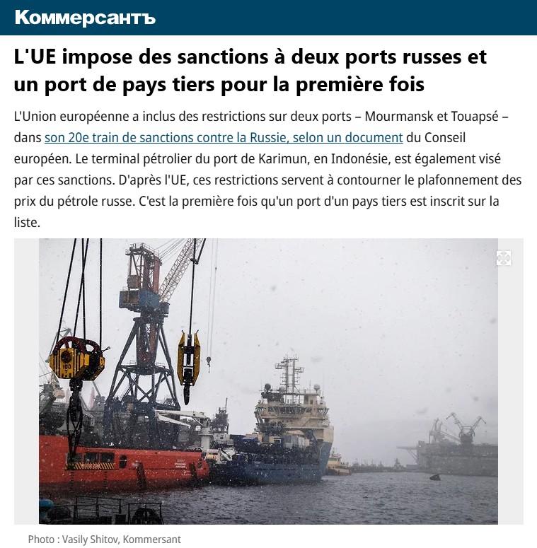 L’Union européenne a inclus des restrictions sur deux ports – Mourmansk et Touapsé – dans son 20e train de sanctions contre la Russie, selon un document du Conseil européen. Le terminal pétrolier du port de Karimun, en Indonésie, est également visé par ces sanctions. D’après l’UE, ces restrictions servent à contourner le plafonnement des prix du pétrole russe. C’est la première fois qu’un port d’un pays tiers est inscrit sur la liste.