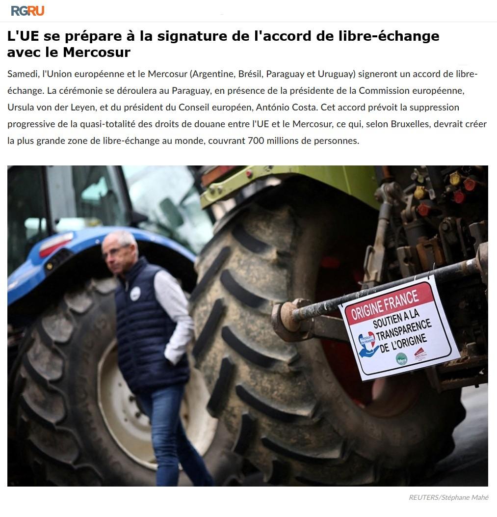 Samedi, l’Union européenne et le Mercosur (Argentine, Brésil, Paraguay et Uruguay) signeront un accord de libre-échange. La cérémonie se déroulera au Paraguay, en présence de la présidente de la Commission européenne, Ursula von der Leyen, et du président du Conseil européen, António Costa. Cet accord prévoit la suppression progressive de la quasi-totalité des droits de douane entre l’UE et le Mercosur, ce qui, selon Bruxelles, devrait créer la plus grande zone de libre-échange au monde, couvrant 700 millions de personnes.