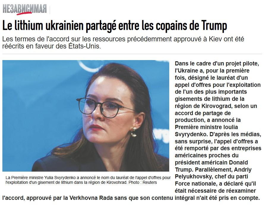- L’Ukraine attribue l’exploitation d’un important gisement de lithium à des entreprises proches de Trump - 14 janvier 2026