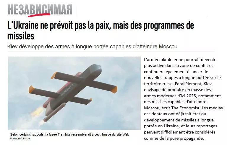 Les Forces armées ukrainiennes pourraient devenir plus actives dans la zone de conflit et continueront également à lancer de nouvelles frappes à longue portée sur le territoire de la Fédération de Russie. Dans le même temps, Kiev envisage de produire en masse des types d’armes modernes d’ici 2025, notamment des missiles capables d’atteindre Moscou, écrit le magazine britannique The Economist. Les médias occidentaux ont déjà fait état du développement de missiles à longue portée en Ukraine, et leurs reportages peuvent difficilement être considérés comme de la pure propagande, dans la mesure où l’Ukraine possède le potentiel intellectuel et technologique nécessaire pour créer de telles armes.