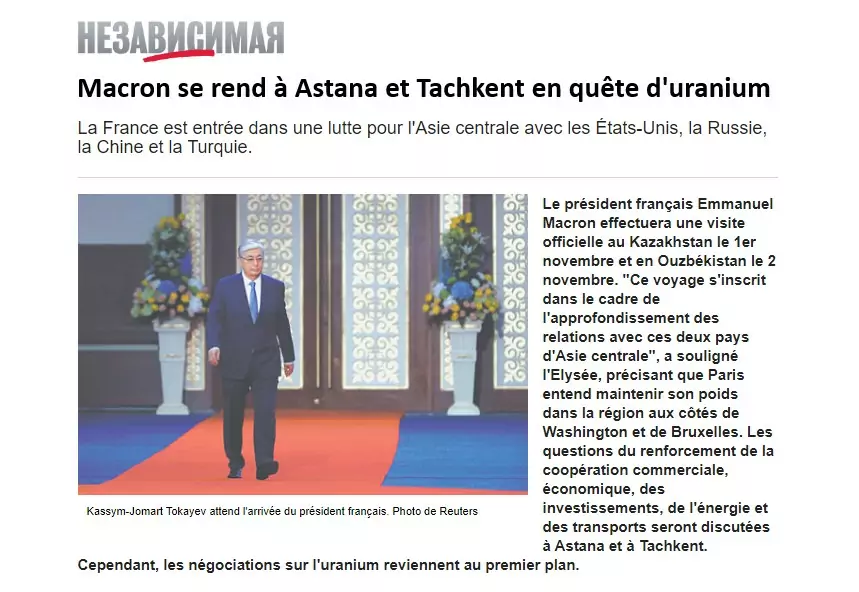 Le président français Emmanuel Macron effectuera une visite officielle au Kazakhstan le 1er novembre et en Ouzbékistan le 2 novembre. “Ce voyage s’inscrit dans le cadre de l’approfondissement des relations avec ces deux pays d’Asie centrale”, a souligné l’Elysée, précisant que Paris entend maintenir son poids dans la région aux côtés de Washington et de Bruxelles. Les questions du renforcement de la coopération commerciale, économique, des investissements, de l’énergie et des transports seront discutées à Astana et à Tachkent. Cependant, les négociations sur l’uranium reviennent au premier plan.
