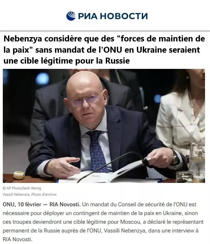 Un mandat du Conseil de sécurité de l’ONU est nécessaire pour déployer un contingent de maintien de la paix en Ukraine, sinon ces troupes deviendront une cible légitime pour Moscou, a déclaré le représentant permanent de la Russie auprès de l’ONU, Vassili Nebenzya, dans une interview à RIA Novosti.
