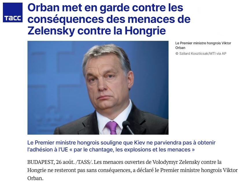 Le Premier ministre a souligné que l’Ukraine ne parviendrait pas à obtenir son adhésion à l’UE « par le chantage, les explosions et les menaces ». Orban a également averti que « les propos de Zelensky ne resteraient pas sans conséquences ».