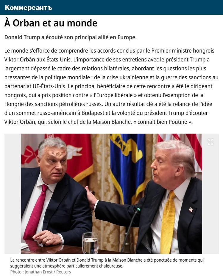 Le monde s’efforce de comprendre les accords conclus par le Premier ministre hongrois Viktor Orbán aux États-Unis. L’importance de ses entretiens avec le président Trump a largement dépassé le cadre des relations bilatérales, abordant les questions les plus pressantes de la politique mondiale : de la crise ukrainienne et la guerre des sanctions au partenariat UE-États-Unis. Le principal bénéficiaire de cette rencontre a été le dirigeant hongrois, qui a pris position contre « l’Europe libérale » et obtenu l’exemption de la Hongrie des sanctions pétrolières russes. Un autre résultat clé a été la relance de l’idée d’un sommet russo-américain à Budapest et la volonté du président Trump d’écouter Viktor Orbán, qui, selon le chef de la Maison Blanche, « connaît bien Poutine ».