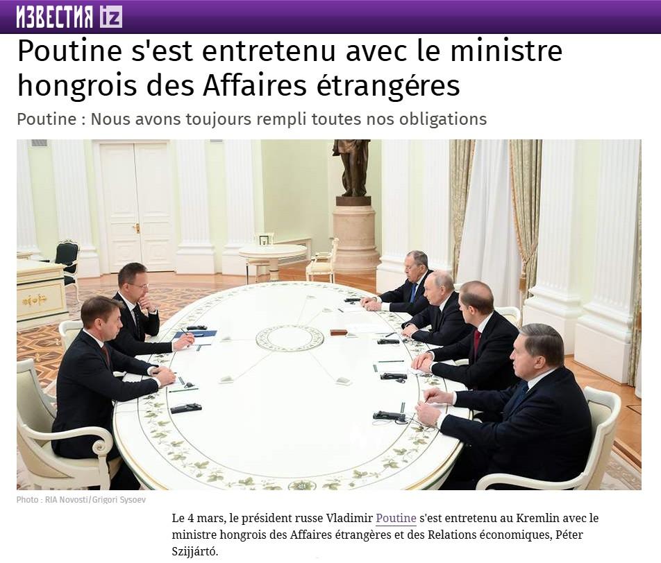 Le 4 mars, le président russe Vladimir Poutine s’est entretenu au Kremlin avec le ministre hongrois des Affaires étrangères et des Relations économiques, Péter Szijjártó.
