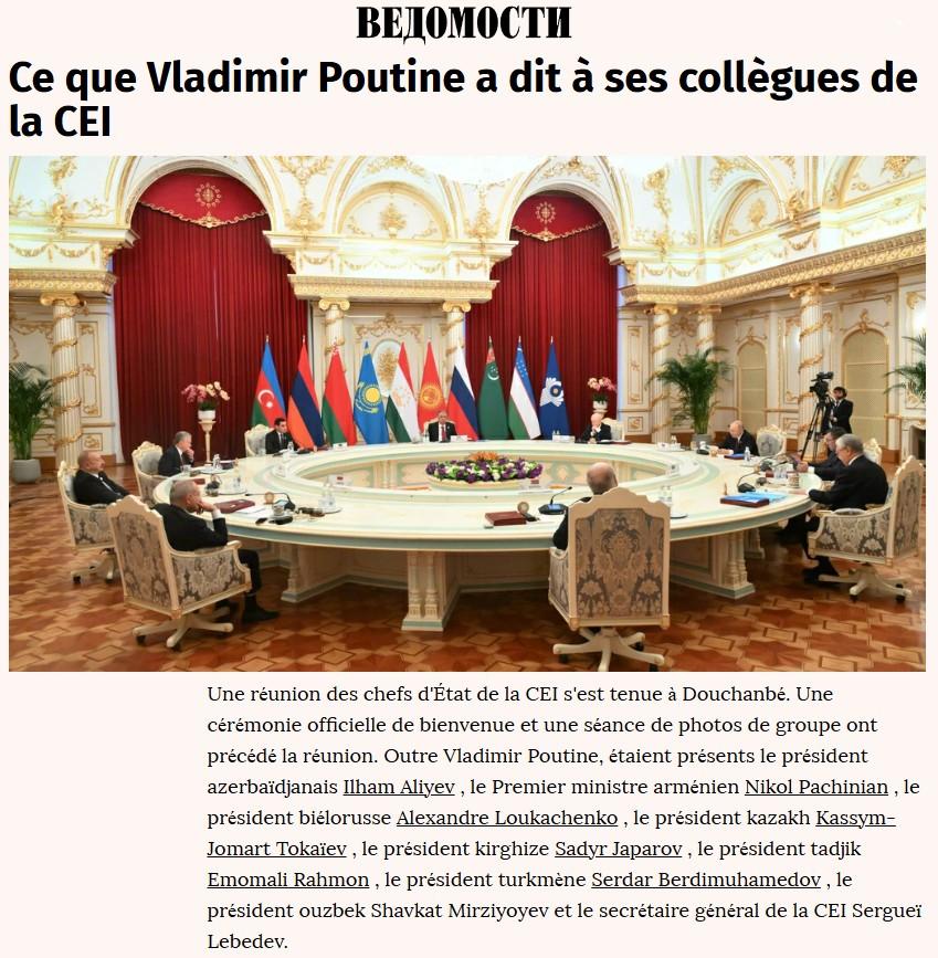 Une réunion des chefs d’État de la CEI s’est tenue à Douchanbé. Une cérémonie officielle de bienvenue et une séance de photos de groupe ont précédé la réunion. Outre Vladimir Poutine, étaient présents le président azerbaïdjanais Ilham Aliyev , le Premier ministre arménien Nikol Pachinian , le président biélorusse Alexandre Loukachenko , le président kazakh Kassym-Jomart Tokaïev , le président kirghize Sadyr Japarov , le président tadjik Emomali Rahmon , le président turkmène Serdar Berdimuhamedov , le président ouzbek Shavkat Mirziyoyev et le secrétaire général de la CEI Sergueï Lebedev.