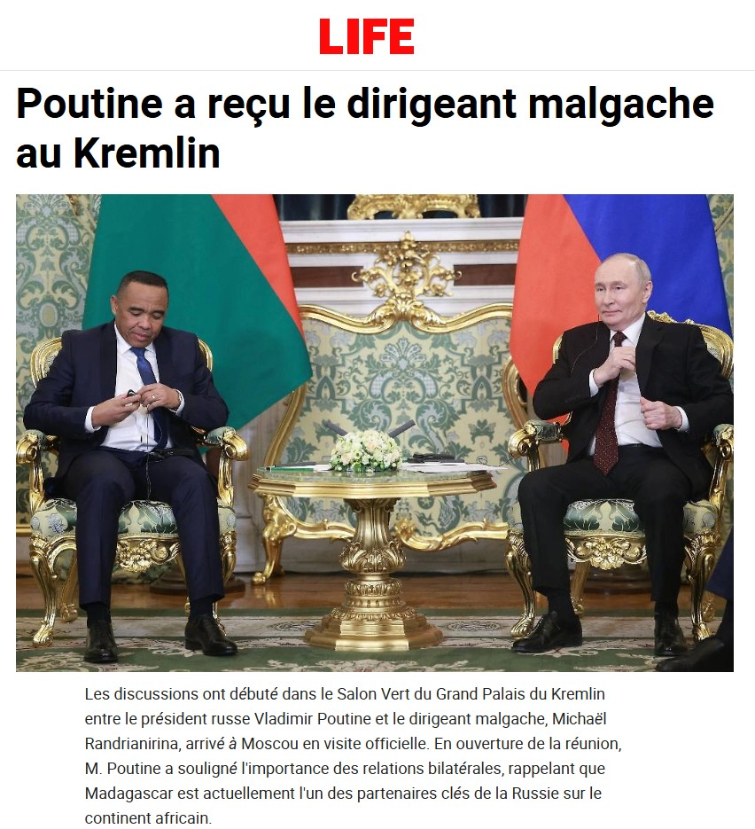 Les discussions ont débuté dans le Salon Vert du Grand Palais du Kremlin entre le président russe Vladimir Poutine et le dirigeant malgache, Mikaël Randrianirina, arrivé à Moscou en visite officielle. En ouverture de la réunion, M. Poutine a souligné l’importance des relations bilatérales, rappelant que Madagascar est actuellement l’un des partenaires clés de la Russie sur le continent africain.