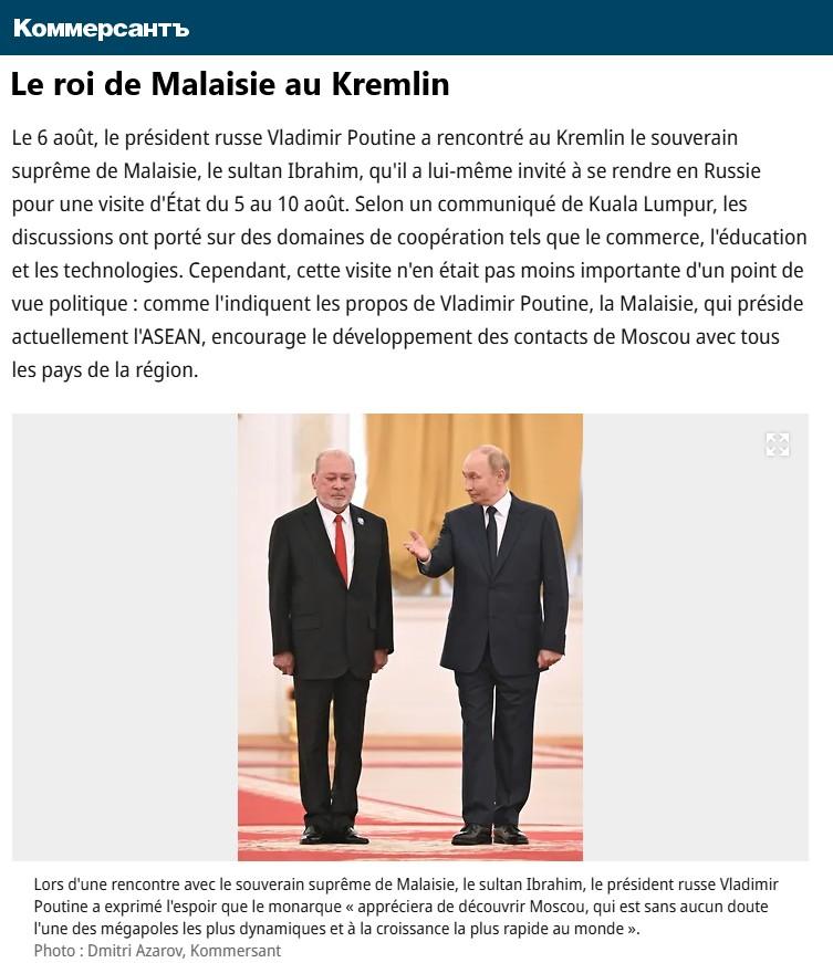Le 6 août, le président russe Vladimir Poutine a rencontré au Kremlin le souverain suprême de Malaisie, le sultan Ibrahim, qu’il a lui-même invité à se rendre en Russie pour une visite d’État du 5 au 10 août. Selon un communiqué de Kuala Lumpur, les discussions ont porté sur des domaines de coopération tels que le commerce, l’éducation et les technologies. Cependant, cette visite n’en était pas moins importante d’un point de vue politique : comme l’indiquent les propos de Vladimir Poutine, la Malaisie, qui préside actuellement l’ASEAN, encourage le développement des contacts de Moscou avec tous les pays de la région.