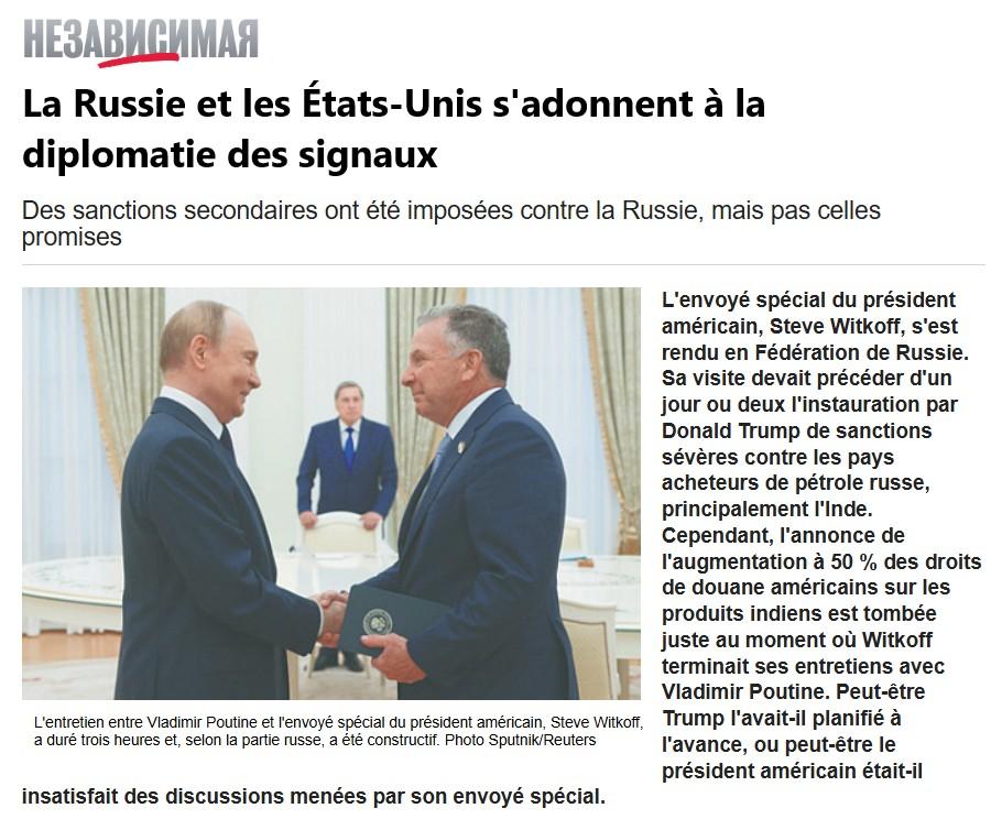 L’envoyé spécial du président américain, Steve Witkoff, s’est rendu en Fédération de Russie. Sa visite devait précéder d’un jour ou deux l’instauration par Donald Trump de sanctions sévères contre les pays acheteurs de pétrole russe, principalement l’Inde. Cependant, l’annonce de l’augmentation à 50 % des droits de douane américains sur les produits indiens est tombée juste au moment où Witkoff terminait ses entretiens avec Vladimir Poutine. Peut-être Trump l’avait-il planifié à l’avance, ou peut-être le président américain était-il insatisfait des discussions menées par son envoyé spécial.