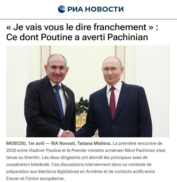 La dernière rencontre entre Poutine et Pachinian remonte à décembre 2025 à Saint-Pétersbourg. À cette occasion, le Premier ministre arménien avait remercié le président russe d’avoir facilité le processus de paix avec l’Azerbaïdjan.