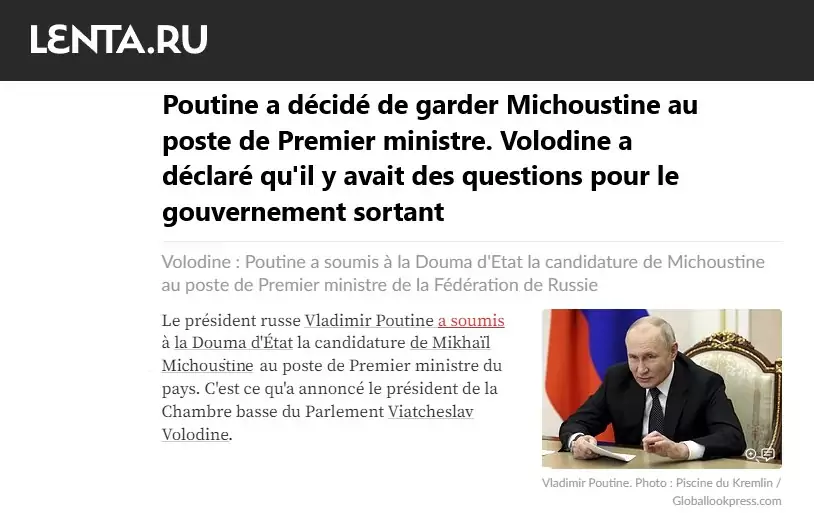 Volodine a précisé que la réunion s’ouvrirait par un rapport de Mikhaïl Michoustine, puis des questions des parlementaires et des discours des représentants des factions seraient entendus, après quoi un vote aurait lieu sur l’approbation de la candidature du chef du gouvernement.