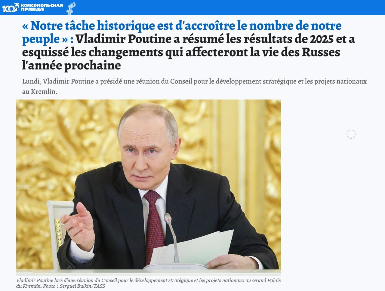 « Les mesures déjà prises sont manifestement insuffisantes », a déclaré Vladimir Poutine. « Malheureusement, le taux de natalité continue de baisser. Il existe clairement des raisons objectives à cela, notamment les tendances démographiques mondiales, ainsi que le cumul des vagues démographiques négatives que nous avons connues au milieu et à la fin du XXe siècle (la Grande Guerre patriotique et la situation du début des années 1990 ont eu l’impact le plus négatif sur la population russe – ndlr). Les défis extérieurs ont également un impact certain. Parallèlement, je tiens à souligner que notre objectif historique à long terme est de préserver et d’accroître la population de notre nation. Et, malgré toutes les difficultés, nous devons maintenir cet objectif. »
