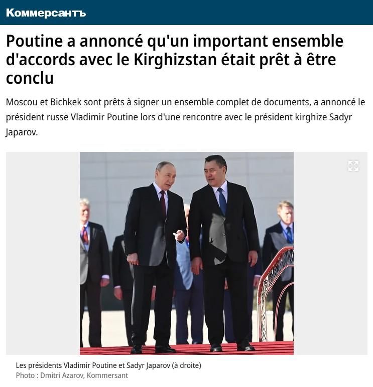 Moscou et Bichkek sont prêts à signer un ensemble complet de documents, a annoncé le président russe Vladimir Poutine lors d’une rencontre avec le président kirghize Sadyr Japarov.