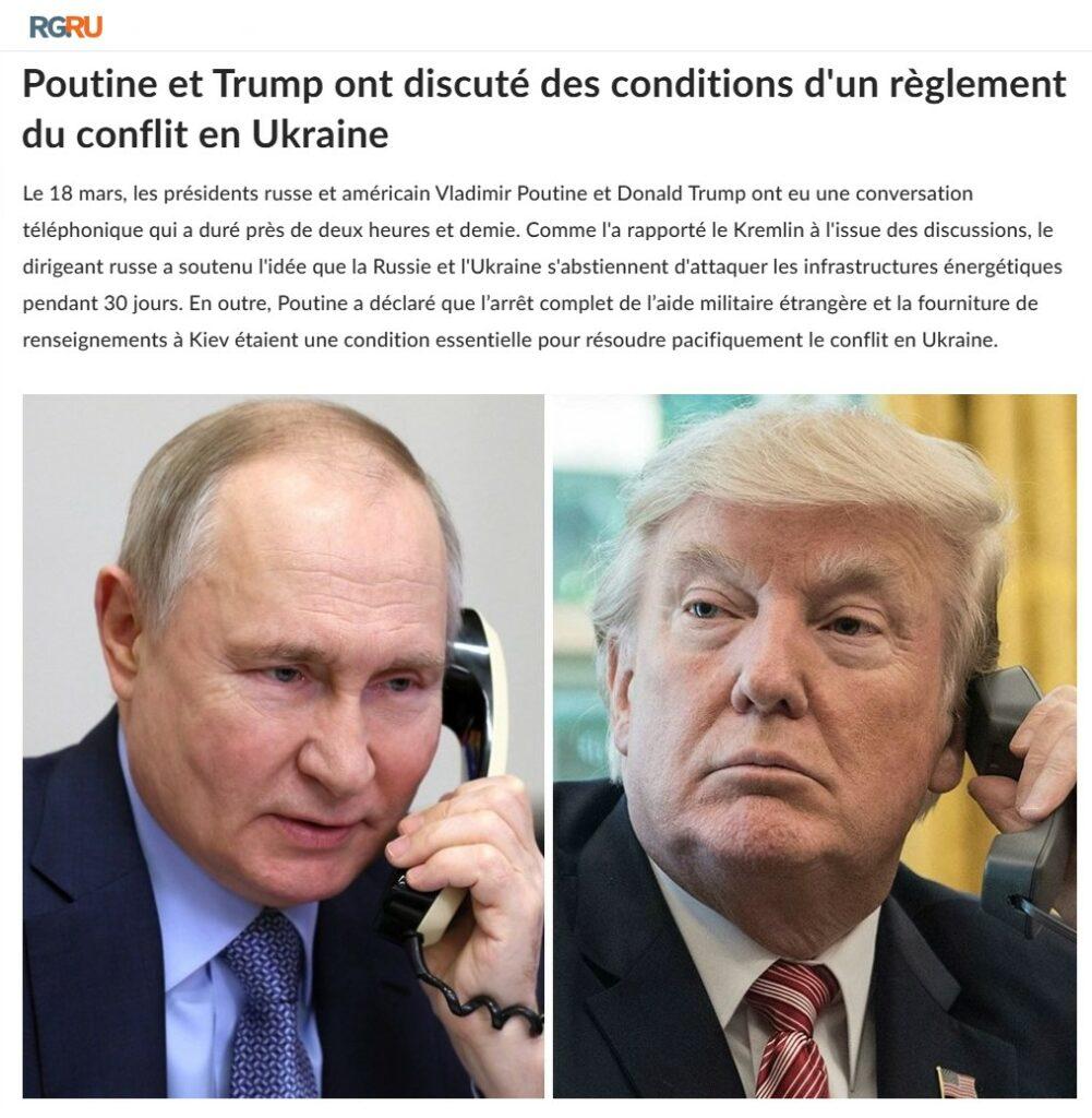 Le 18 mars, les présidents russe et américain Vladimir Poutine et Donald Trump ont eu une conversation téléphonique qui a duré près de deux heures et demie. Comme l’a rapporté le Kremlin à l’issue des discussions, le dirigeant russe a soutenu l’idée que la Russie et l’Ukraine s’abstiennent d’attaquer les infrastructures énergétiques pendant 30 jours. En outre, Poutine a déclaré que l’arrêt complet de l’aide militaire étrangère et la fourniture de renseignements à Kiev étaient une condition essentielle pour résoudre pacifiquement le conflit en Ukraine.