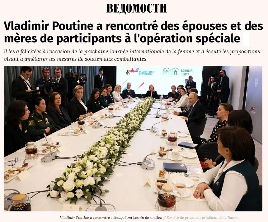 Au début de la rencontre, Poutine a félicité les personnes présentes à l’occasion de la prochaine Journée internationale de la femme. « Dans notre pays, nous célébrons toujours cette fête avec une attention particulière aux femmes, à tout le monde – mères, petites amies, épouses, collègues », a-t-il déclaré. Il a adressé des mots de remerciement particuliers aux participantes de l’opération spéciale et aux employées de la Fondation « Défenseurs de la Patrie ».