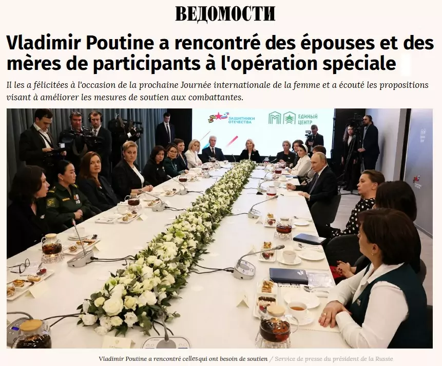 Le président russe Vladimir Poutine a rencontré des participantes et des femmes vétérans de l’opération spéciale, des épouses et des mères de militaires, ainsi que des employées du fonds d’État « Défenseurs de la Patrie ». La réunion a eu lieu au Centre de soutien unifié pour les participantes de l’opération spéciale et les membres de leurs familles, et a été diffusée par le Kremlin.