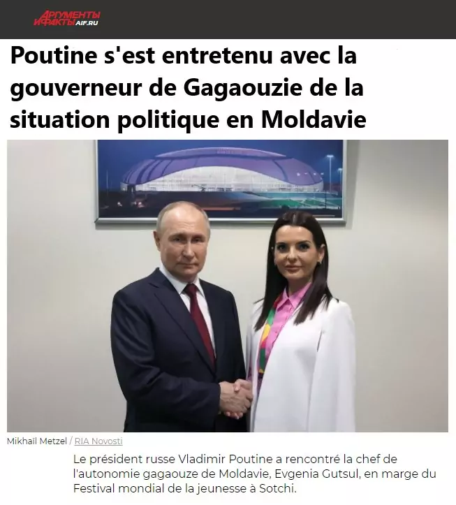 Le président russe Vladimir Poutine a rencontré la chef de l’autonomie gagaouze de Moldavie, Evgenia Gutsul, en marge du Festival mondial de la jeunesse à Sotchi. Gutsul fournit des détails sur la réunion sur sa chaîne Telegram.