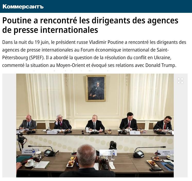 Dans la nuit du 19 juin, le président russe Vladimir Poutine a rencontré les dirigeants des agences de presse internationales au Forum économique international de Saint-Pétersbourg (SPIEF). Il a abordé la question de la résolution du conflit en Ukraine, commenté la situation au Moyen-Orient et évoqué ses relations avec Donald Trump.