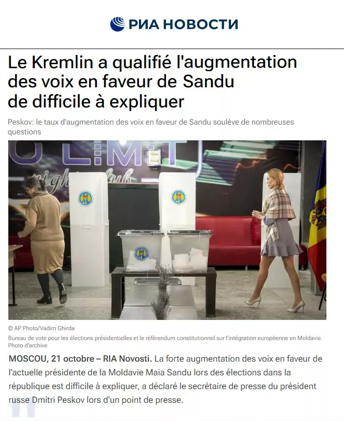La forte augmentation des voix en faveur de l’actuelle présidente de la Moldavie Maia Sandu lors des élections est difficile à expliquer, a déclaré le porte-parole du président russe Dmitri Peskov lors d’un point de presse.