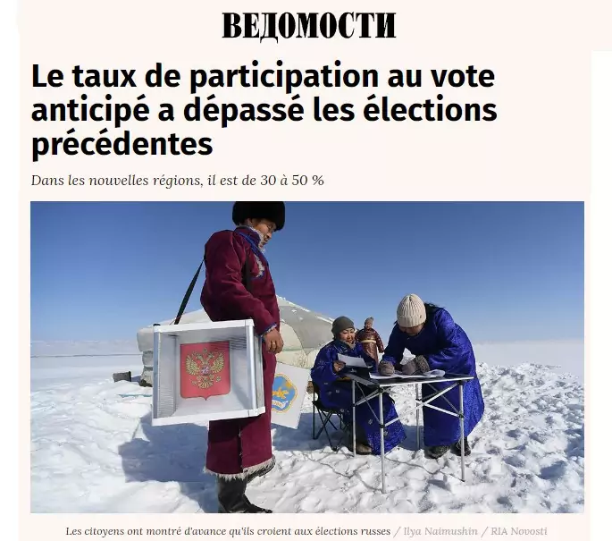 Au 11 mars, plus de 1,4 million de citoyens de 39 régions russes avaient voté par anticipation, a rapporté la Commission électorale centrale (CEC). Cela représente environ 1,24 % du nombre total d’électeurs en Russie (112,3 millions de personnes). Le 6 mars, Pavel Andreev, membre de la CEC, a parlé de 600 électeurs à l’étranger (il y a encore 1,89 million d’électeurs à l’étranger).