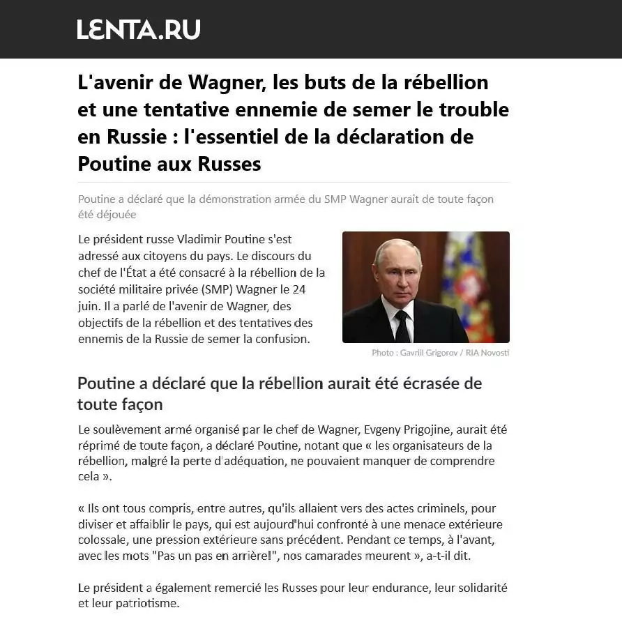 Rébellion de Wagner : Poutine déclare que le soulèvement aurait de toute façon été supprimé